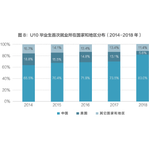 10月30日消息,CCG與LinkedIn發(fā)布的報告顯示,2014-2018年U10畢業(yè)生中首次就業(yè)在中國的比例逐年增長,且2018年增長明顯,從73.5%增加到83.0%。雖超七成畢業(yè)生在深造選擇中傾向于去往國外,但超八成畢業(yè)生首次就業(yè)所在國為中國,呈現(xiàn)出國留學—回國就業(yè)良性環(huán)流。