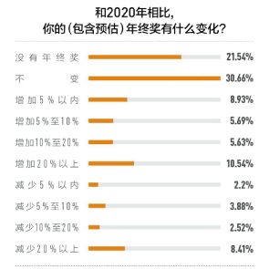 1月30日消息,《第一財經(jīng)》YiMagazine發(fā)布調(diào)查顯示,超過7成的人薪酬上漲,而近一半薪酬漲幅在10%以內(nèi),而薪酬不變和降薪的人數(shù)占比分別為15.98%和13.44%。和2020年相比,年終獎金額不變,21.54%的人表示2021年沒有年終獎。