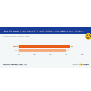 1月14日消息,Honeypot發(fā)布的《2021年開(kāi)發(fā)者幸福指數(shù):全球洞察》報(bào)告顯示,平均開(kāi)發(fā)人員的幸福度評(píng)分為61分(滿分100分),而經(jīng)合組織公民的65分。81%的女性表示工作與生活的平衡對(duì)于職業(yè)幸福感非常重要,而男性則為75%。