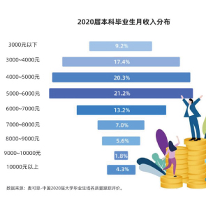 1月14日消息,MYCOS發(fā)布《2021年中國本科生就業(yè)報告》顯示,僅4.3%的2020屆本科生畢業(yè)半年后月收入過萬。超七成本科生畢業(yè)起薪在3000~7000元。其中2020屆本科生畢業(yè)半年后月收入5000~6000元占21.2%,4000~5000元占20.3%。