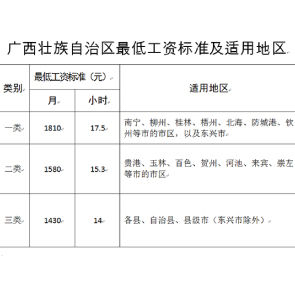 1月20日消息,廣西壯族自治區(qū)人社廳發(fā)布的《通知》規(guī)定,調(diào)整最低工資標(biāo)準(zhǔn)。月最低工資標(biāo)準(zhǔn)由原1680元、1450元、1300元分別上調(diào)至1810元、1580元、1430元,非全日制小時最低工資標(biāo)準(zhǔn)也由原16元、14元、12.5元分別調(diào)至17.5元、15.3元、14元。
