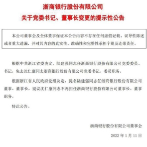1月12日消息,浙商銀行稱,沈仁康因工作安排需要辭去浙商銀行執(zhí)行董事、董事長、戰(zhàn)略委員會(huì)主任委員及普惠金融發(fā)展委員會(huì)主任委員職務(wù)。同時(shí),陸建強(qiáng)任浙商銀行黨委委員、書記,免去沈仁康浙商銀行黨委書記、委員職務(wù)。
