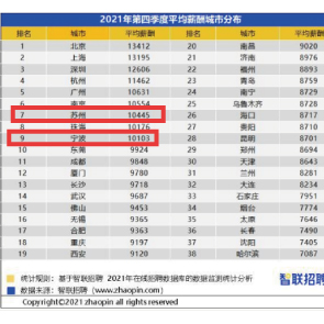 1月10日消息,智聯(lián)招聘發(fā)布2021第四季度企業(yè)招聘薪酬報告顯示,蘇州、寧波兩地新晉為萬元月薪城市。在寧波,雇主們?yōu)榇T士及以上學歷開出15907元平均招聘薪酬,本科12534元,大專9958元,高中及以下降到8155元。