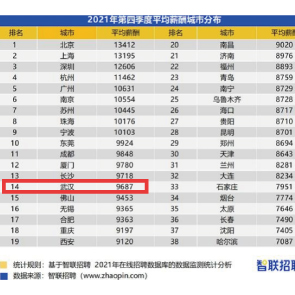 1月7日消息,智聯(lián)招聘發(fā)布2021四季度《中國企業(yè)招聘薪酬報告》,武漢2021年第四季度平均招聘薪酬為9687元,全國排14。武漢地區(qū)碩士及以上學歷招聘平均月薪最高,達15218元/月,本科學歷12495元/月。
