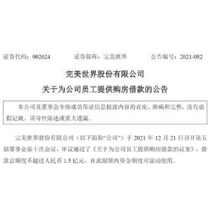 12月22日消息,完美世界稱,董事會(huì)審議通過(guò)《關(guān)于為公司員工提供購(gòu)房借款的議案》,借款總額度不超過(guò)人民幣 1.5 億元,在此限額內(nèi)資金額度可滾動(dòng)使用。借款對(duì)象為與公司或下屬子公司簽訂勞動(dòng)合同的員工。董監(jiān)高管理人員除外。