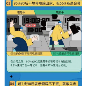 12月9日消息,36氪發(fā)布的數(shù)據(jù)統(tǒng)計顯示,76%的90后不等領(lǐng)導(dǎo)下班就先走,其中55%敢光明正大走,21%選擇趁領(lǐng)導(dǎo)不注意偷偷溜走。超九成90后表示下班不想帶電腦回家。雖然95%的90后不想帶電腦回家,但事實上66%還是會帶電腦回家。