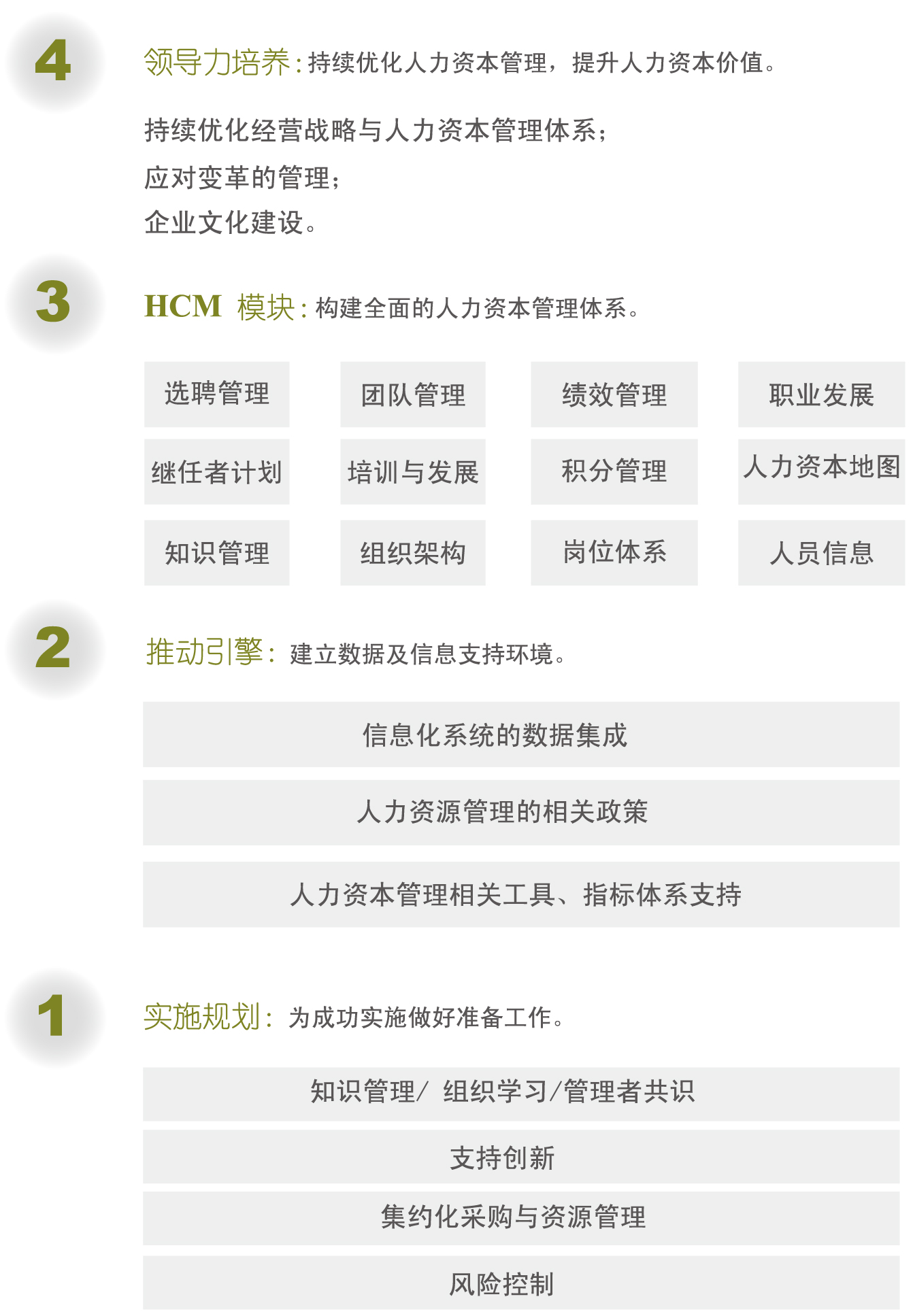 HCM軟件模塊的實施基于現(xiàn)狀的診斷與目標的解讀,同時配套專業(yè)人力資源咨詢顧問的咨詢方案,整合管理標準與應用工具,保證了產(chǎn)品上線后100%的無縫移交與順利應用。此外,我們會將管理團隊的領導力建設、管理職能、員工管理責任與系統(tǒng)解決方案緊密聯(lián)系在一起,這是人力資源管理體系進階的必要條件。