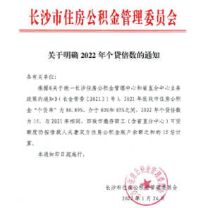 1月29日消息,長沙住房公積金管理中心發(fā)布《通知》明確,2021年底長沙市住房公積金個貸率為80.89%,2022年個貸倍數(shù)為15,即長沙市繳存職工可貸額度仍按借款人夫妻雙方住房公積金賬戶余額之和的15倍計算。
