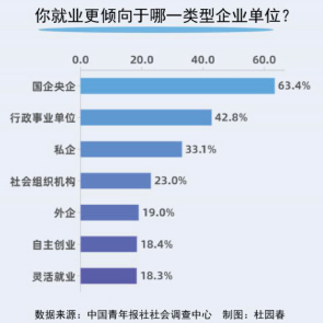 1月18日消息,中國青年報發(fā)布的調(diào)查顯示,對于畢業(yè)后想在哪類單位就職,63.4%應(yīng)屆生選擇央企國企,42.8%選擇行政事業(yè)單位,33.1%喜歡私企。其他社會組織機(jī)構(gòu)23.0%、外企19.0%、自主創(chuàng)業(yè)18.4%、靈活就業(yè)18.3%。