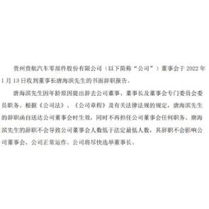 1月14日消息,貴航股份稱,唐海濱因年齡原因提出辭去公司董事、董事長及董事會專門委員會委員職務(wù)。唐海濱的辭呈自送達(dá)公司董事會時生效,同時不再擔(dān)任董事會任何職務(wù)。2020年公司披露年報顯示,唐海濱薪酬63.13萬元。