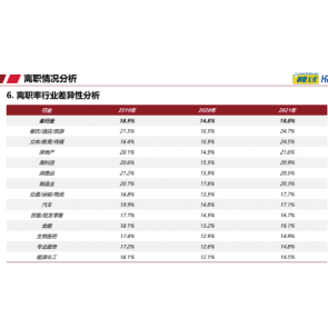 12月22日消息,前程無(wú)憂發(fā)布《2022離職與調(diào)薪調(diào)研報(bào)告》顯示,與2020年相比,2021年員工整體離職率18.8%,回升4.0%。2021年餐飲/酒店/旅游行業(yè)離職率24.7%居首,文體/教育/傳媒、房地產(chǎn)離職率相對(duì)較高,分別為24.5%、21.6%居第二、三位。